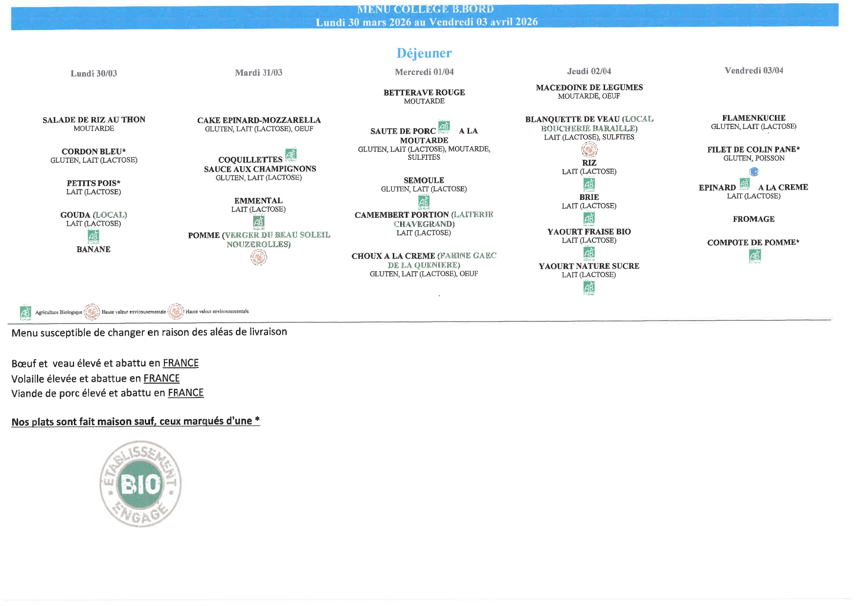 Menu du 30 mars au 3 avril 2026 (nos plats sont faits maison sauf ceux signalés *