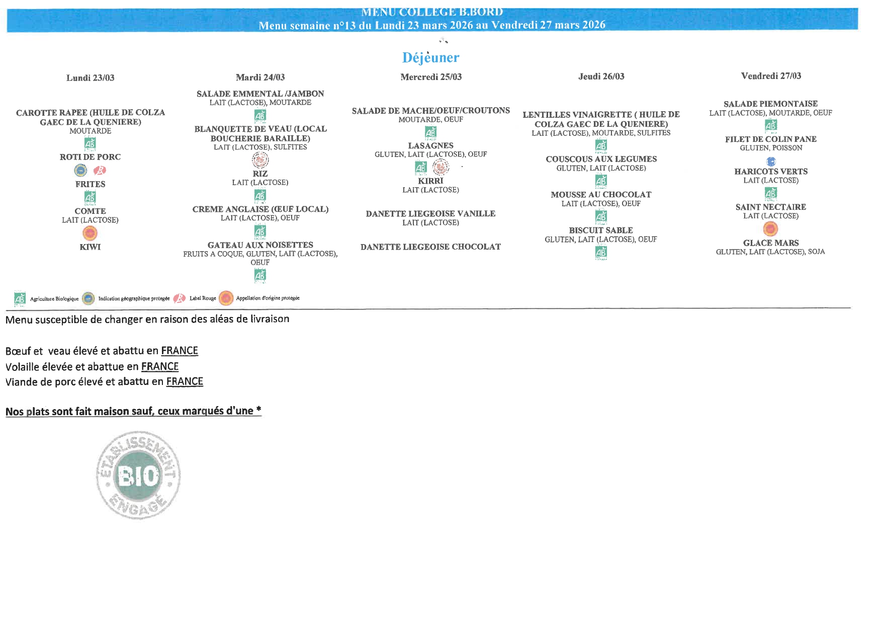 Menu du 23 au 27 Mars 2026 (nos plats sont faits maison sauf ceux signalés *)