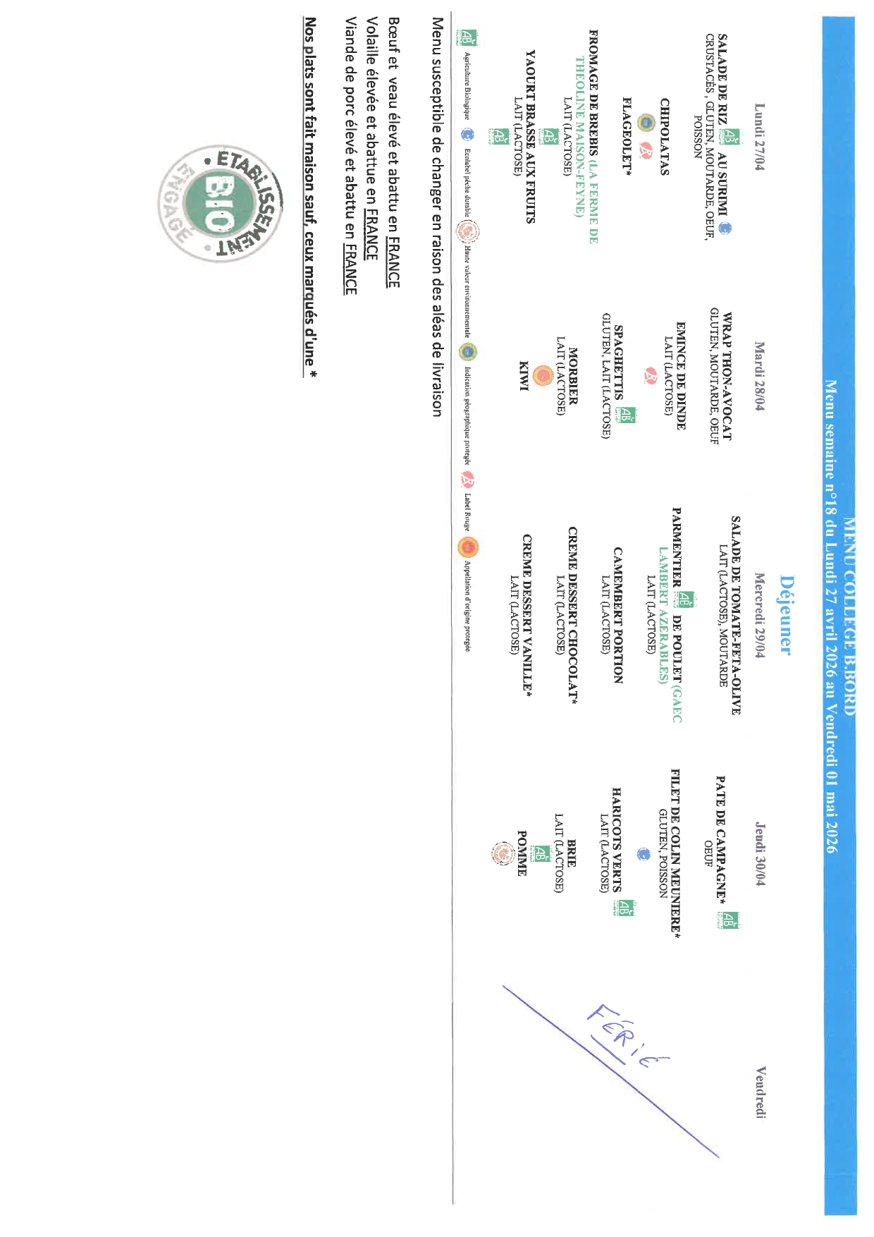 Menu du 27 avril au 01 mai 2026 (nos plats sont faits maison sauf ceux signalés *
