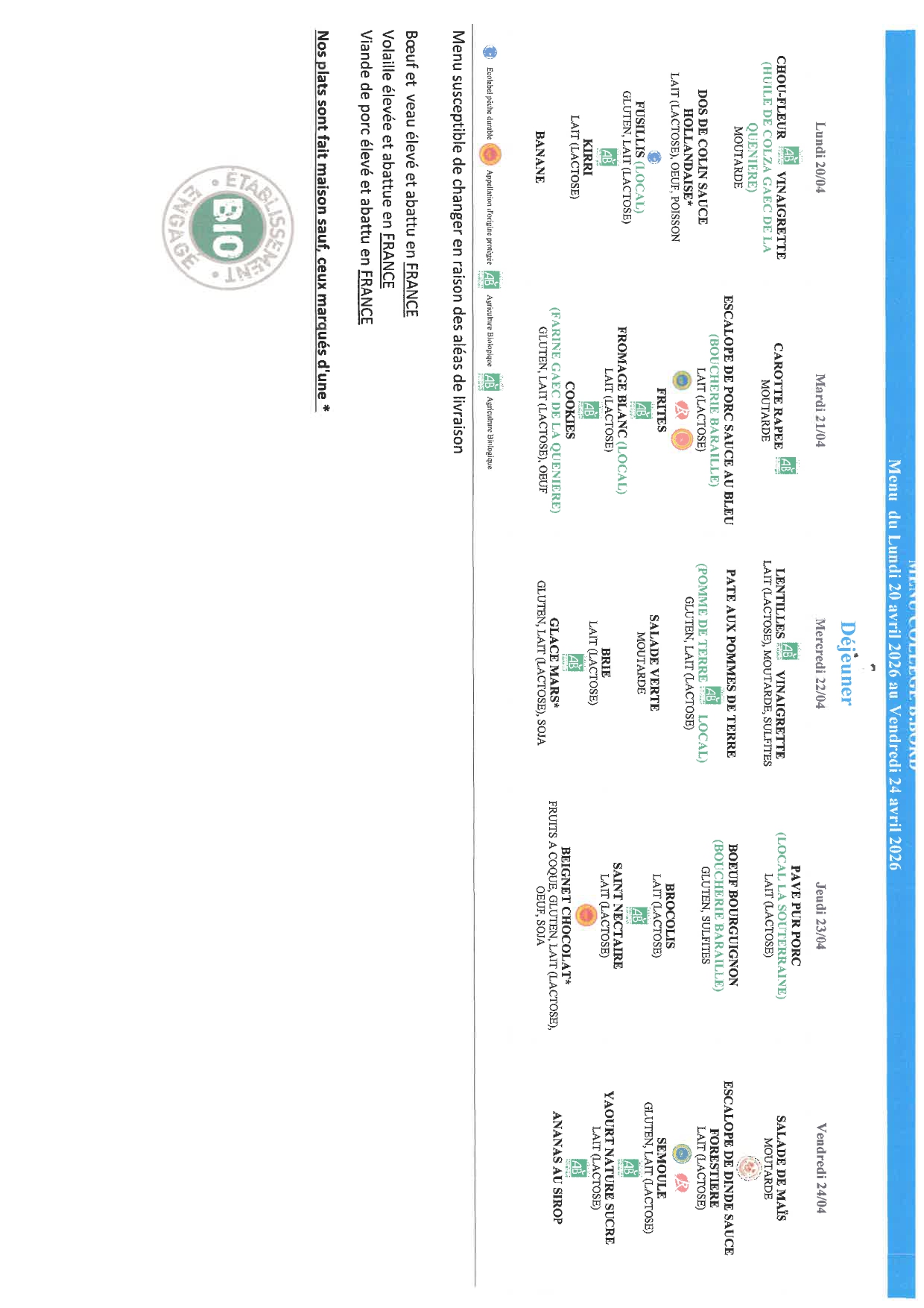 Menu du 20 avril au 24 avril 2026 (nos plats sont faits maison sauf ceux signalés *